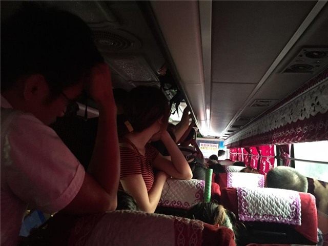 | Bên trong chiếc xe khách về Hà Nội, hàng ghế 2 ngồi 3 người còn lối đi chính giữa nhồi chật kín, khách phải đứng một chân. Ảnh: Nguyễn Hữu Quỳnh - otofun |