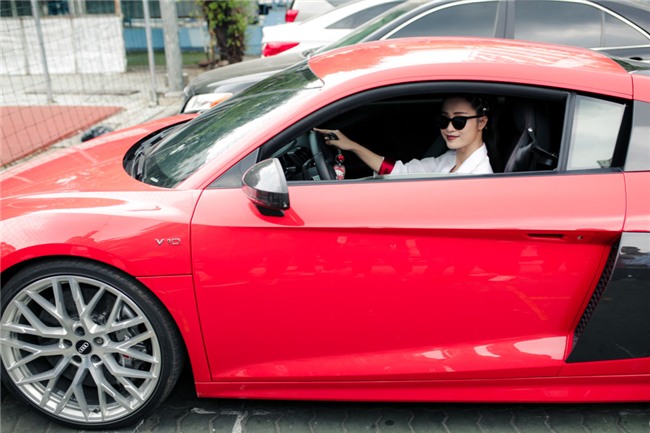 Nữ ca sĩ Vì ai vì anh nổi bật trên siêu xe Aaudi R8 V10 Plus. Đây là món quà do Ông Cao Thắng và Đông Nhi mua để tự thưởng cho thành quả của cả hai sau một năm 2016 làm việc cật lực. |