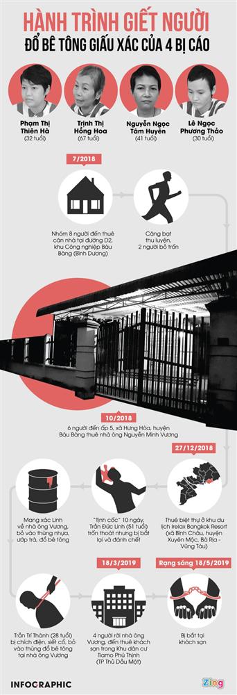 Đường phạm tội của 4 phụ nữ giấu xác trong bê tông. Nhóm của Phạm Thị Thiên Hà thuê nhiều địa điểm ở Khánh Hòa, Bình Dương, Vũng Tàu để tu luyện. Hai người không chịu được khổ cực đã bị họ sát hại và đổ bê tông.