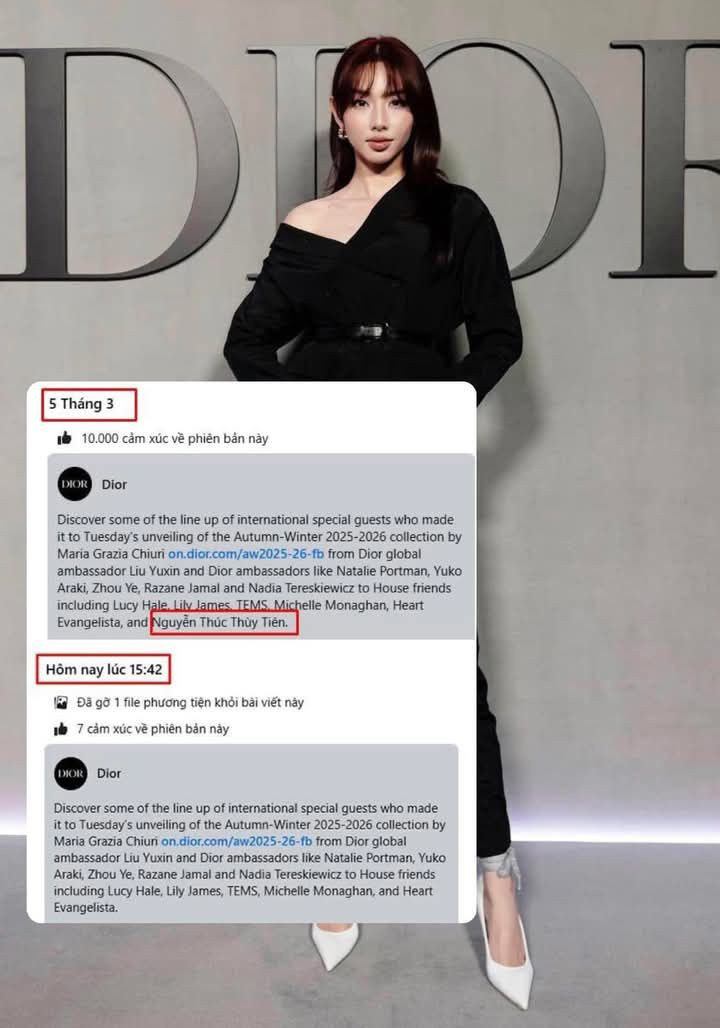 Dior chính thức xóa hình Hoa hậu Thuỳ Tiên trên trang Facebook chính thức của mình. Cụ thể bài đăng ngày 5/3/2025 đã xoá hình và gỡ tag Thuỳ Tiên. Phần lịch sử chỉnh sửa hiển thị Dior đã thay đổi bài đăng lúc 15h42 cùng ngày. Trước đó, Thùy Tiên được giới thiệu là Friend of The House (bạn thân thương hiệu). Cô cũng có mặt trên hàng ghế khách mời của thương hiệu tại Paris Fashion Week ngày 4/3.