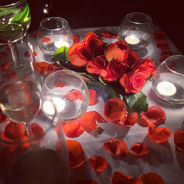 Quang Vinh chỉ đăng hình một bàn ăn với rượu và hoa hồng