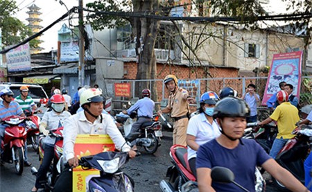 Giao thông trên đường Phan Văn Trị qua hiện trường bị ùn tắc cả hai chiều lưu thông. Lực lượng CSGT phải vất vả phân luồng.
