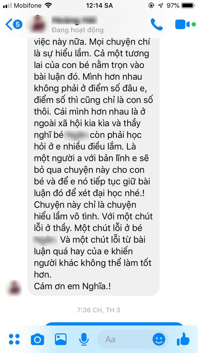 Chốt lại cuộc nói chuyện ngày hôm nay là mình nhận hai cái "đã xem" từ hai người, ok mình chỉ muốn đòi lại công bằng cho mọi người đang tham gia kì thi ưu tiên xét tuyển này vì đó là cơ hội rất tốt cho các em của mình, và yeah câu cuối cùng trước khi để mọi người đọc hết tất cả tin nhắn của mình với hai thầy trò kia".