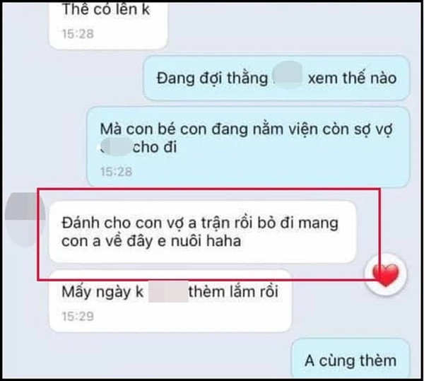 Tiểu tam còn bồi thêm: "Đánh cho con vợ anh 1 trận rồi bỏ đi mang con anh về đây em nuôi. Haha".