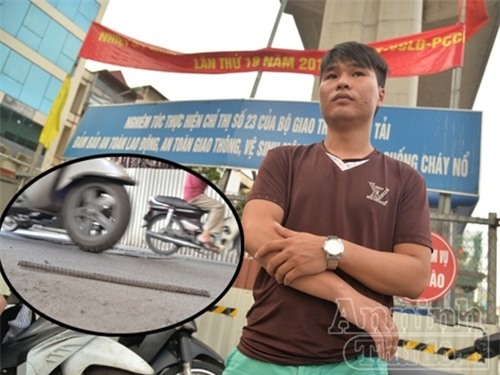 Sau khi nhận được phản ánh từ đường dây nóng, PV đã có mặt tại hiện trường để ghi nhận vụ việc. Chưa hết bàng hoàng, anh Nguyễn Minh Thắng (trú tại phố Nguyên Hồng, quận Đống Đa, Hà Nội) cho biết, khoảng 4h20 chiều 4-5, khi đang di chuyển trên phố Hoàng Cầu theo hướng từ Đê La Thành ra Thái Hà, đến đoạn công trường thi công hạng mục ga Hoàng Cầu thì bỗng nhiên một thanh sắt dài khoảng 40 cm rơi từ trên công trường xuống trúng tay, khiến anh Thắng lảo đảo. Sau đó, phần cánh tay anh Thắng bị thanh sắt rơi vào nhanh chóng sưng to. “May mà thanh sắt không rơi vào đầu chứ không tôi cũng không biết sẽ ra sao”, anh Thắng nói.