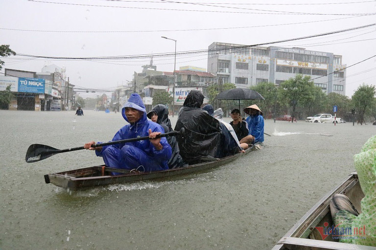 Mưa lớn gây ngập lụt ở TP Huế khiến người dân phải đi ghe trên đường, hồi trung tuấn tháng 11. Ảnh: Đình Thành