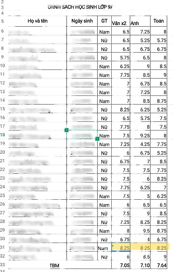 Bảng điểm kết quả thi tuyển sinh vào 10 của cả lớp, tác giả là 1 trong 2 người có điểm Văn cao nhất lớp (phần bôi vàng - 8.25 điểm). Ảnh: TGCC
