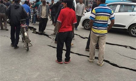 Một đoạn đường ở thủ đô Nepal nứt nẻ sau thiên tai. Phóng viên K. Dhiksit của IBN tại Kathmandu kể rằng vào thời điểm xảy ra động đất, anh nghe thấy "những âm thanh cực lớn" và người dân lao ra đường. Trong khi đó, Manesh Shrestha, phóng viên của CNN, cho biết: "Khung cảnh khá hỗn loạn. Mọi người khóc vì sợ hãi". Ảnh: Twitter