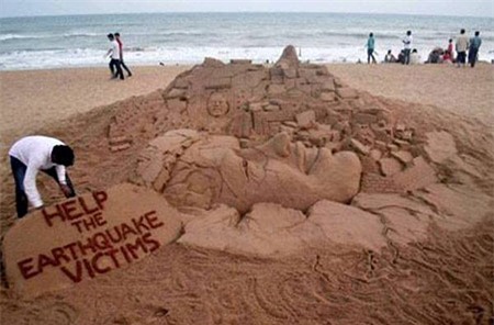 Thông điệp "Hãy giúp nạn nhân động đất Nepal" trên một công trình điêu khắc bằng cát ở bãi biển Puri, Ấn Độ. Ảnh: Times of India