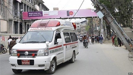 Xe cứu thương đến hiện trường cứu hộ các nạn nhân của trận động đất. Bộ Nội vụ Nepal cho biết chính phủ nước này đã giải nhân 500 triệu USD để phục vụ công tác cứu nạn tại các khu vực chịu hậu quả của động đất. Ảnh: EPA