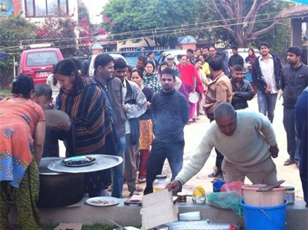 Người dân ở Katmandu đổ xô tới các quầy bán thức ăn ngoài trời bởi các cửa hàng trong thành phố đóng cửa sau trận động đất. Người dân và du khách ngủ ngoài trời đêm qua vì lo ngại dư chấn tiếp tục xảy ra. Ảnh: New York Times