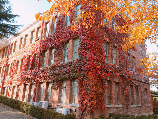 Khuôn viên trường được trồng rất nhiều loại cây khác nhau với tán lá đổi màu theo mùa cực đẹp mắt.