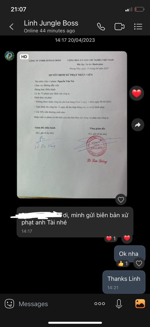 Sau khi tiếp nhận thông tin, phía công ty đã phản hồi với du khách rằng hướng dẫn viên đã nhận lỗi và cung cấp biên bản kỷ luật nội bộ về việc đình chỉ công tác 15 ngày, cắt giảm tài chính với hướng dẫn viên trên.
