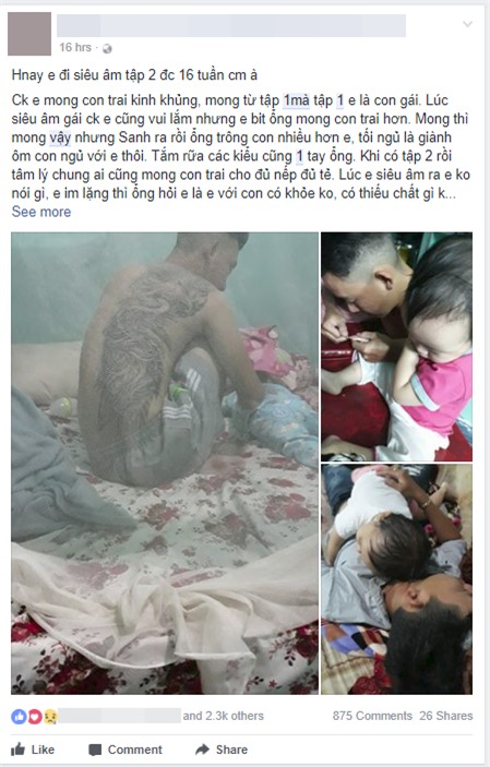 Đoạn chia sẻ của tài khoản Đ.P như sau: "Hôm nay em đi siêu âm tập 2 được 16 tuần các mẹ à. Chồng em mong con trai kinh khủng, mong từ tập 1 mà tập 1 em là con gái. Lúc siêu âm là gái chồng em cũng vui lắm nhưng em biết ông mong con trai hơn.