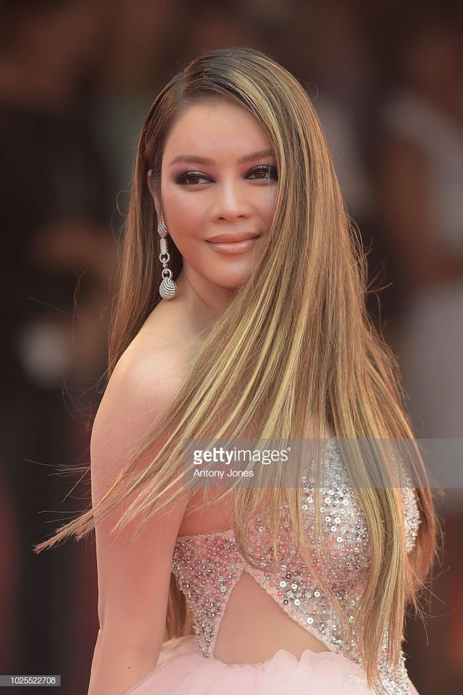 Đang da nâu bánh mật vừa đẹp vừa khỏe, chẳng hiểu sao Hoàng Thùy lại chuyển style mặt trắng bệch lệch tông hẳn so với màu da vùng cổ và cánh tay khiến cô nhìn như tượng tạc chứ không phải là một nàng Á hậu.