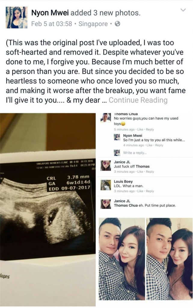 Theo chia sẻ của Nyon Mwei, suốt thời gian yêu anh chàng đẹp mã có tên Thomas Chua, cô đã luôn phải kìm nén bản thân cũng như những ức chế mà mình phải chịu đựng. "Suốt thời gian yêu nhau, dù có xảy ra cãi vã nhưng em cũng chưa từng một lần chỉ trích anh trên Facebook. Em thậm chí còn không được tâm sự với mẹ hay người bạn thân nhất của mình. Chỉ bởi vì anh muốn giữ được "ấn tượng tốt" với người khác..."