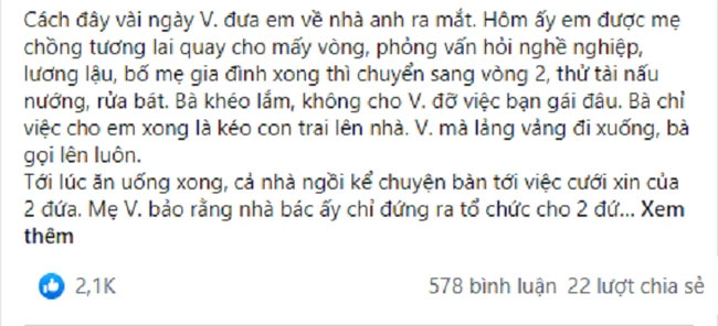 Cô kể: "Cách đây vài ngày, V. đưa em về nhà anh ra mắt. Hôm ấy em được mẹ chồng tương lai quay cho mấy vòng, phỏng vấn hỏi nghề nghiệp, lương lậu, bố mẹ gia đình xong thì chuyển sang vòng 2, thử tài nấu nướng, rửa bát. Bà khéo lắm, không cho V. đỡ việc bạn gái đâu. Bà chỉ việc cho em xong là kéo con trai lên nhà. V. mà lảng vảng đi xuống, bà gọi lên luôn.