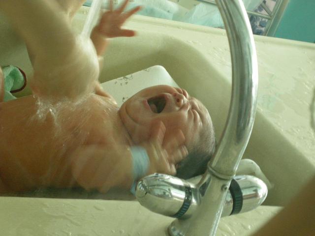 Khi đứa bé chào đời, cơ thể dính đầy vết máu và một số chất bẩn khác nên y tá sẽ tắm rửa toàn thân cho các bé, sau khi bé được vệ sinh sạch sẽ sẽ cân và ghi lại số cân nặng.