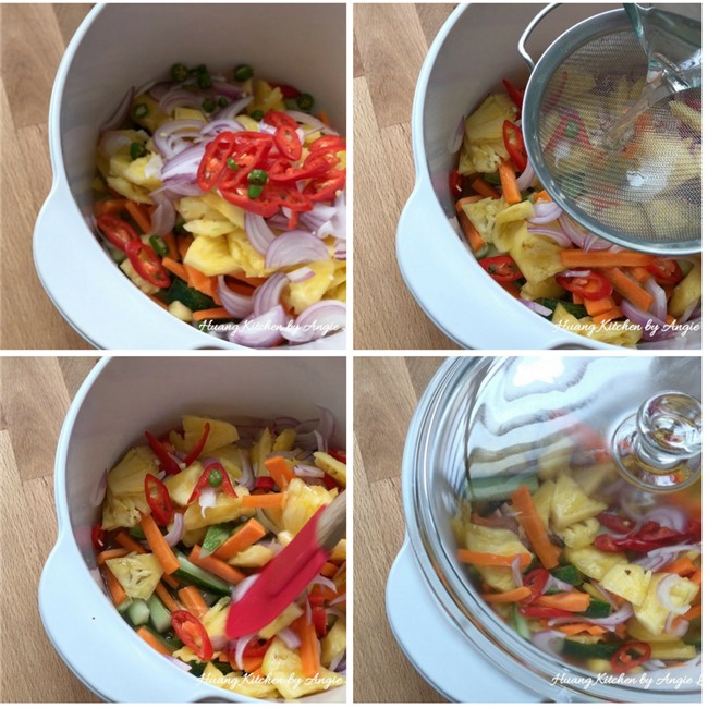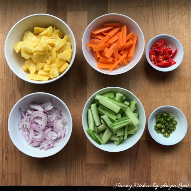Dưa chuột rửa sạch, nạo bỏ ruột, cắt miếng dưa dài 4cm rộng 0,5cm. Cà rốt nạo vỏ cắt miếng như dưa chuột. Dứa thái miếng nhỏ vừa ăn. Hành tây thái lát mỏng. Ớt thái lát chéo.