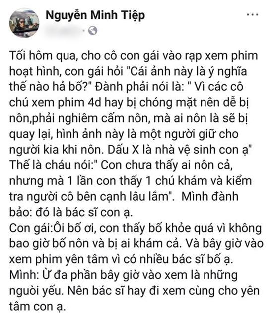 "Ông bố một con" Minh Tiệp vừa mới chia sẻ một câu chuyện khó xử mà anh đã phải trải qua khi con gái hỏi về chiếc biển lạ ở rạp chiếu phim. Khi hai bố con cùng đi xem phim hoạt hình, bé chỉ vào tấm biển và hỏi: "Cái ảnh này là ý nghĩa thế nào hả bố?"