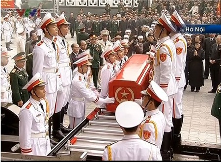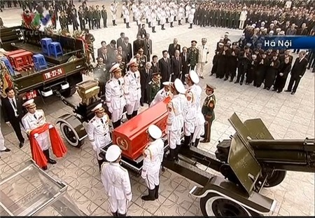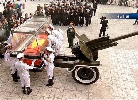 7h: Nghi thức chào cờ tại lễ truy điệu Đại tướng bắt đầu tại nhà tang lễ Quốc gia, số 5 Trần Thánh Tông, Hà Nội.