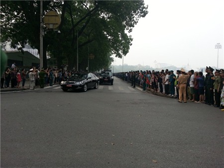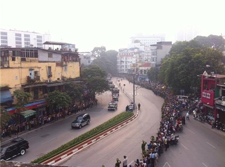 Đoàn xe tiếp tục lăn bánh theo lộ trình Trần Phú - Sơn Tây - Kim Mã - Cầu Giấy - Xuân Thủy - Phạm Văn Đồng - Thăng Long đến sân bay Nội Bài