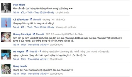 - "Người dân hai bên đường khóc òa khi đoàn xe đưa lĩnh cữu Đại tướng đi qua. Họ cùng gọi hai chữ "Cha ơi" trong tiếng nấc nghẹn ngào"