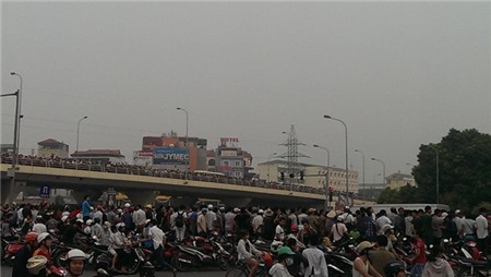 Người dân đứng trên cầu vượt tại ngã tư Xuân Thủy - Phạm Hùng chờ đón đoàn xe rước linh cữu Đại tướng đi qua tuyến đường Xuân Thủy - Phạm Văn Đồng. Ảnh: Độc giả Thu Hà