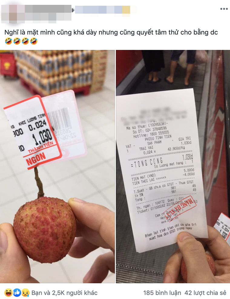 Cách đây không lâu, một dân mạng có tên V.T.M đã khiến cộng đồng mạng xôn xao khi chia sẻ câu chuyện vào siêu thị mua đúng 1 quả vải với giá 1.030 đồng. Anh chàng này cho biết: "Nghĩ là mặt mình cũng khá dày nên cũng quyết tâm thử cho bằng được". Kèm theo đó, V.T.M còn chụp ảnh quả vải được đích thân anh chàng lựa chọn và tờ hóa đơn làm bằng chứng khiến nhiều người phải phì cười.