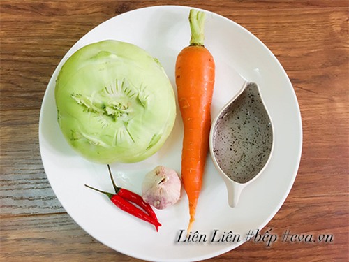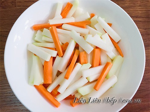 Bước 1: Su hào, cà rốt gọt vỏ, rửa sạch, thái miếng cỡ con chì hoặc tuỳ ý.