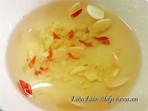 Bước 4: Pha hỗn hợp nước gồm: 500ml nước sôi, 2 thìa nước mắm, 2 thìa dấm, 2 thìa đường. Sau khi pha xong có thể nếm lại cho phù hợp khẩu vị. Tiếp tục cho tỏi ớt vào cùng hỗn hợp.