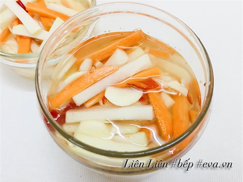 - Làm nước ngâm su hào: 500ml nước sôi, 2 thìa nước mắm, 2 thìa dấm, 2 thìa đường