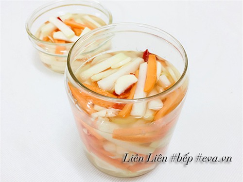Bước 6: Sau đó cho hỗn hợp nước đã pha chút vào cùng. Ngâm khoảng nửa ngày là ăn được. Khi su hào ăn được thì có thể bỏ ngăn mát tủ lạnh để bảo quản được lâu hơn.