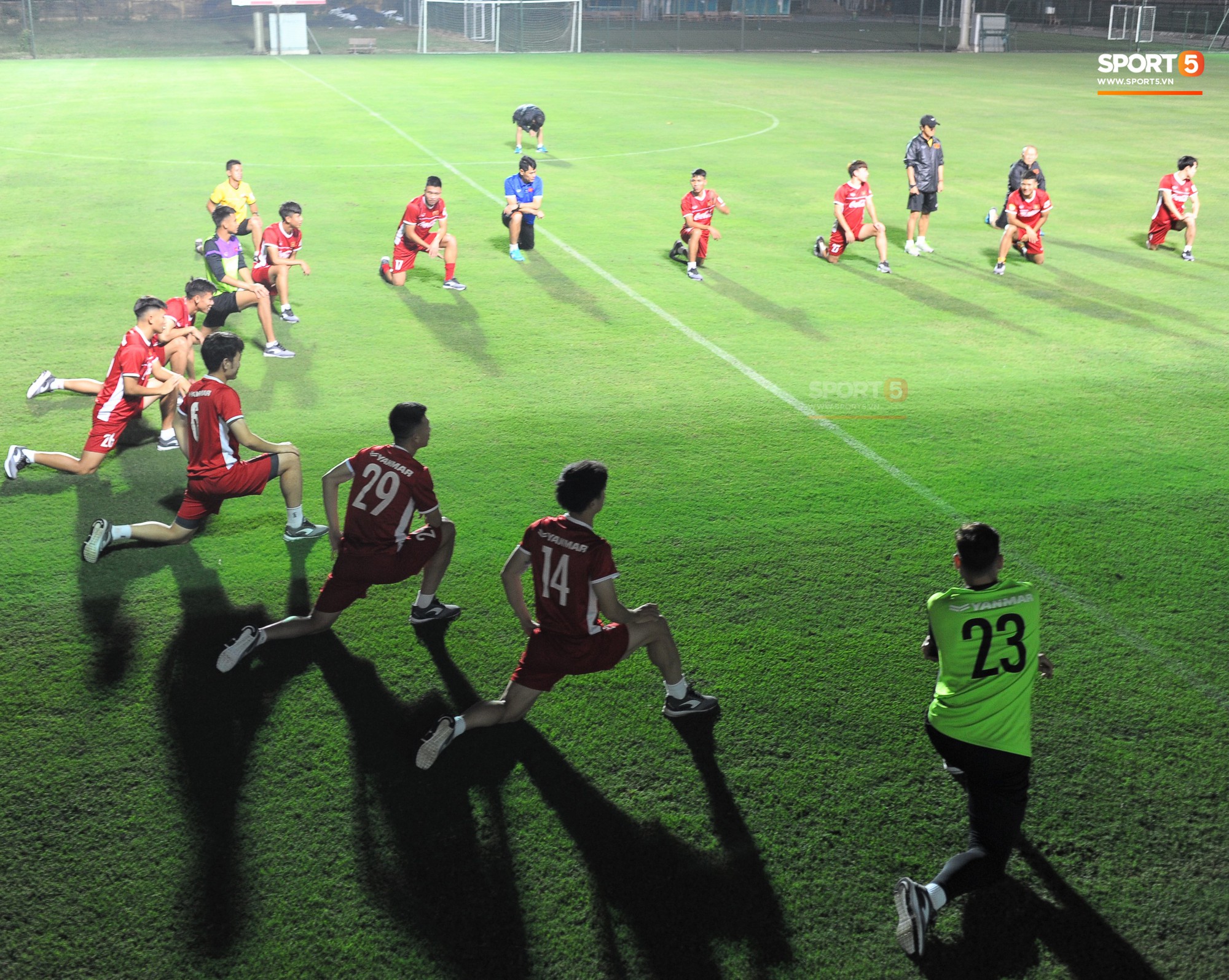 Ngoài các cầu thủ, chiến lược gia người Hàn Quốc cũng để mắt đến việc HLV thủ môn Nguyễn Đức Cảnh và trợ lý Lư Đình Tuấn không mặc đúng áo tập đến sân. Buổi tập bắt đầu lúc 20h với nội dung rèn thể lực tại phòng gym nằm trong khuôn viên Trung tâm đào tạo bóng đá trẻ Việt Nam. Các cầu thủ có 20 phút để chạy bộ và khởi động nhẹ nhàng trước khi bước vào bài tập thể lực khá nặng.