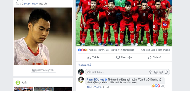 Và có lẽ, chính sự xông xáo của tiền vệ 23 tuổi này đã khiến anh bị "chỉ mặt gọi tên" trong cuộc kiểm tra doping sau trận đấu. Chia sẻ trên trang cá nhân của mình, Đức Huy cho biết: "Vừa đi thử Doping về vì cái tội chạy nhiều . Giờ mới ăn với tắm xong".