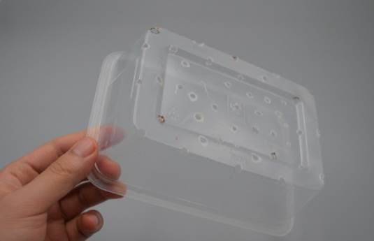 Dùng mỏ hàn hoặc dây sắt nung đỏ chọc một vài lỗ nhỏ dưới đáy hộp cơm và bạn có thể dùng nó làm rổ thoát nước. Có thể đặt miếng rửa rau, rửa trái cây, cọ rửa vào đó để ráo nước, rất đơn giản, tiện lợi và thiết thực.