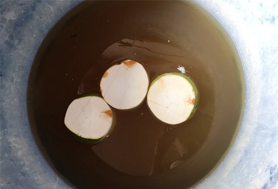 Ông Hồng nói với phóng viên: “Nếu dừa bình thường sau khi chặt ra chỉ 5 phút đã đen xì và xấu xí. Nhưng khi ngâm dừa vào chất bột nói trên sẽ trắng đến 7 ngày”.