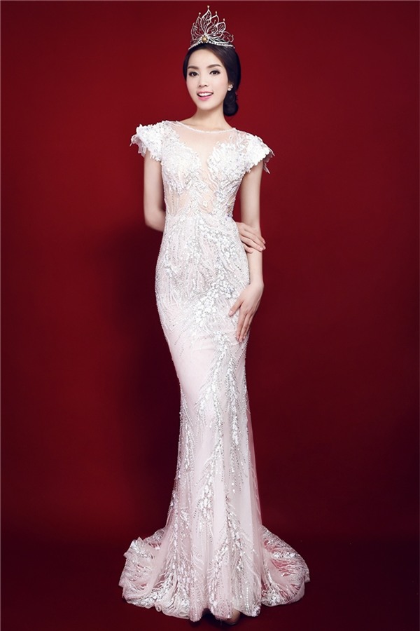 Khoác lên mình chiếc váy đính đá và ngọc trai và kim sa tinh sảo nhập từ nước ngoài của nhà thiết kế Hoàng Hải càng làm tôn lên nét trẻ trung thanh khiết của hoa hậu.