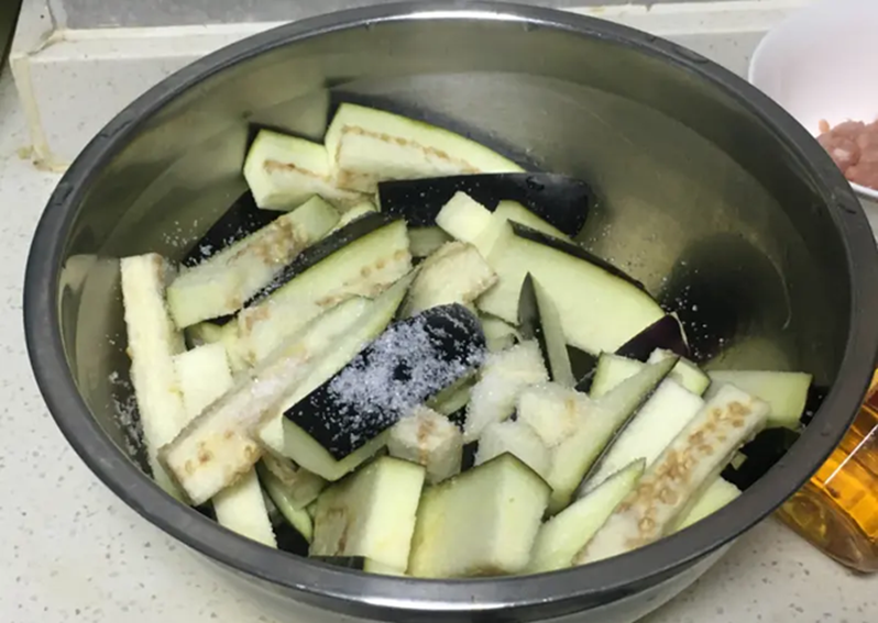 2. Trộn cà tím với muối rồi ướp, điều này có thể phá hủy cấu trúc, khiến cà tím không hút đẫm dầu khi chiên.
