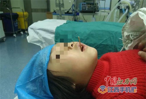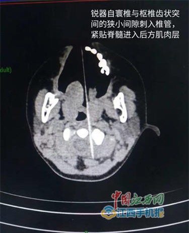 Sau khi kiểm tra, bác sĩ Diêu Hạo Quân tại bệnh viện số 1 Đại học Nam Xương cho biết, que xiên len qua khe hở hẹp giữa răng và đi xuống phía xương cột sống, gần tủy sống rồi xuyên qua lớp cơ phía sau của bệnh nhân.