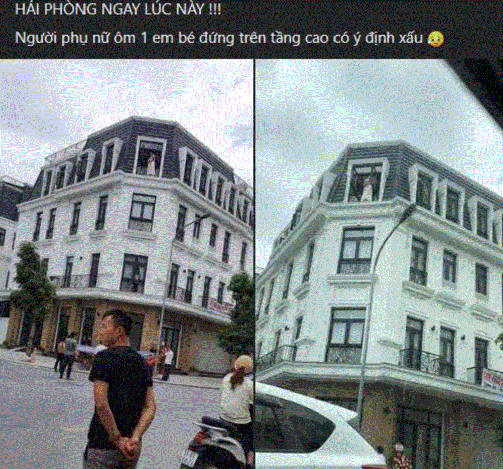 Ngày 12/5, một phụ nữ ở Hải Phòng ôm con ngoài cửa sổ, nghi có ý định nhảy lầu. Nhiều người căng bạt đứng chờ hứng mẹ con chị phía dưới đường. Hình ảnh này khiến cư dân mạng xót xa.