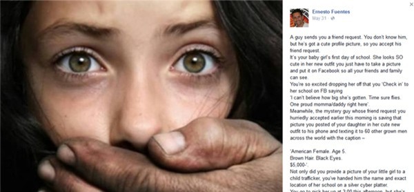 Ngày 21/5, một facebook của người nước ngoài tên Ernesto Fuentes đăng bài viết cảnh báo một vụ bắt cóc và bán bé gái 5 tuổi người Mỹ với giá 5.000 USD cho một kẻ mắc chứng ấu dâm (thích quan hệ tình dục với trẻ em) khiến nhiều người giật mình.