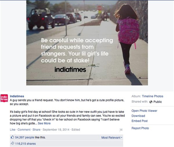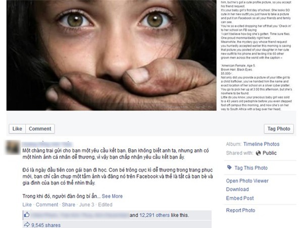 "Bạn không chỉ cung cấp hình ảnh cô bé của bạn cho một kẻ buôn trẻ em, bạn còn đưa cho hắn tên và vị trí chính xác nơi con bé học" - Facebook này nhấn mạnh sự nguy hiểm khi đăng tải thông tin và hình ảnh trẻ con lên mạng xã hội.