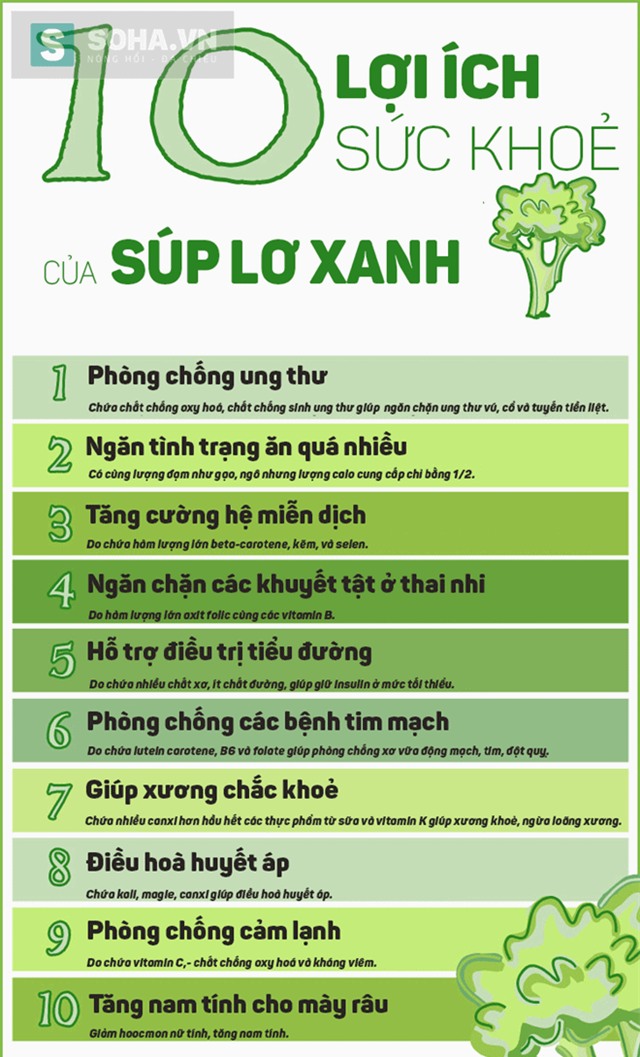 Súp lơ xanh cũng được biết đến là thực phẩm giúp xương chắc khoẻ, khôi phục da bị tác động xấu bởi ánh nắng mặt trời, tăng cường hệ miễn dịch, tốt cho mắt, tốt cho hệ tiêu hoá.