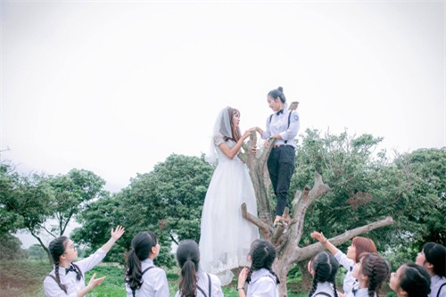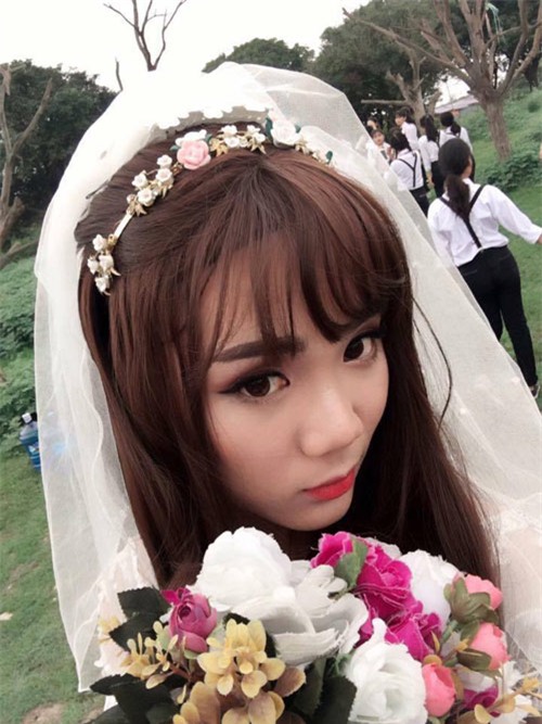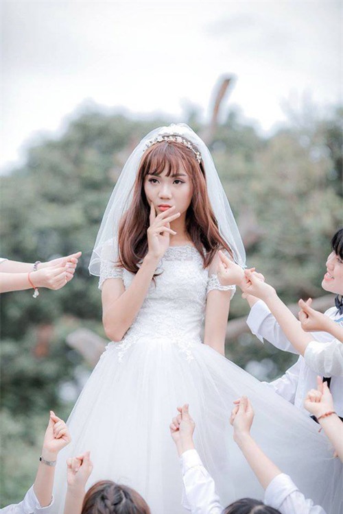 Cô dâu trong bộ ảnh là bạn nam tên Dương Minh Huy "Ở lớp Huy rất hoà đồng với mọi người. Bạn rất vui tính và hay chọc cười các bạn nữa. Huy học khá là ổn và đặc biệt bạn ấy học tốt môn Lịch sử. Nhìn xinh vậy thôi chứ bạn ấy chuẩn men 100%", Ngọc Dung tiết lộ.