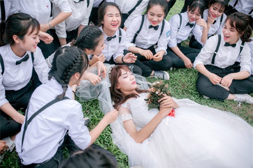Bộ ảnh độc đáo này thuộc về lớp 12A6 chuyên Văn của trường THPT Lý Thái Tổ, Bắc Ninh. Theo chia sẻ của bạn Ngô Thị Ngọc Dung, một thành viên trong lớp cho biết: "Lớp có 38 học sinh thì có 37 người là nữ, còn lại đúng 1 "mì chính cánh". Vì sĩ số chênh lệnh như vậy nên các em quyết định cho ra đời bộ ảnh kỷ yếu "Chú rể đại chiến" của lớp chuyên Văn".