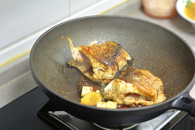 - Khi chiên cá, bạn cho lượng dầu nhiều hơn một chút so với lượng chiên thông thường vì lượng dầu này khi kho sẽ giúp cá mềm hơn. Không lật cá hoặc lắc chảo lúc mới cho cá vào. Đợi cá chín vàng một mặt thì mới lật, thời gian khoảng 2 – 3 phút, làm vậy thì da cá sẽ không bị nát.