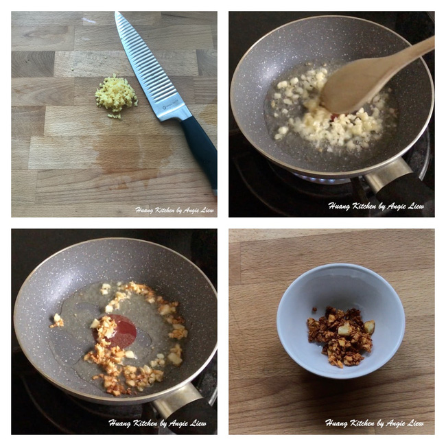 Đầu tiên, bạn băm nhỏ gừng. Đặt chảo lên bếp, thêm chút dầu ăn vào, dầu nóng thì cho tỏi vào phi thơm. Tỏi vàng thì vớt ngay ra.