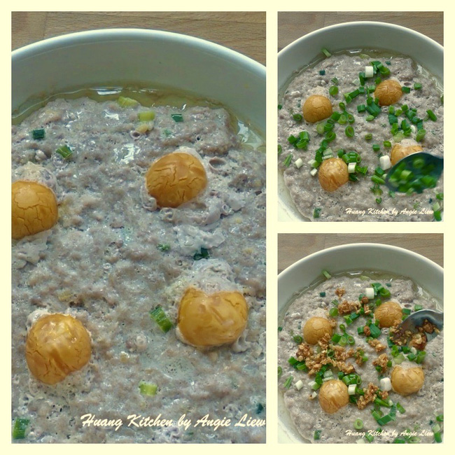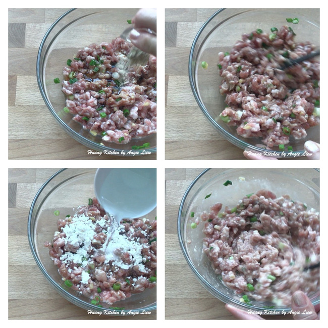 Chuẩn bị sẵn thịt xay rồi cho vào tô. Cho lòng trắng trứng muối vào, thêm gừng băm nhỏ và một ít hành lá thái nhỏ vào trộn đều. Tiếp theo cho tất cả gia vị, bột ngô và nước vào. Khuấy cho đến khi hỗn hợp đồng nhất, thịt có độ kết cấu rất dính.