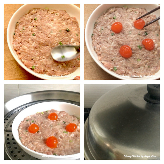 Cho hỗn hợp thịt vào trong một đĩa tròn, sâu lòng và có khả năng chịu nhiệt. Dùng thìa ấn nhẹ thịt xuống để hỗn hợp thịt nén chặt xuống đĩa. Sau đó xếp lòng đỏ trứng muối lên trên. Chuẩn bị nồi hấp bằng cách đun sôi nước và cho thịt vào nồi hấp. Đậy vung và hấp trên lửa vừa trong vòng 20 - 25 phút đến khi thịt hấp chín.